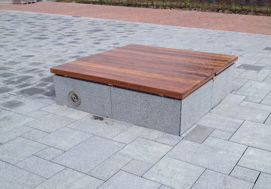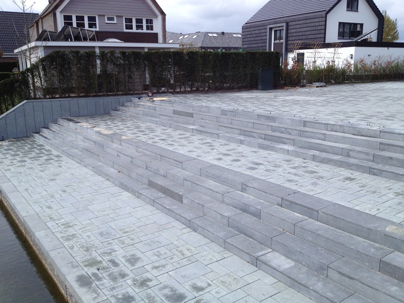 Hier gaat het om een volledig in natuursteen uitgevoerd plein in Giraniet G399 en OlivinBasalt G684 welke middels natuurstenen traptreden, afm. 50x20 cm (bxh) doorloopt tot aan het water.