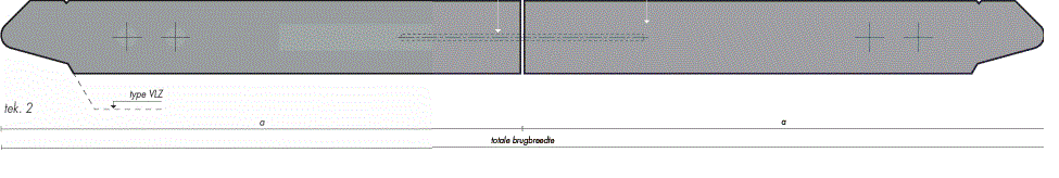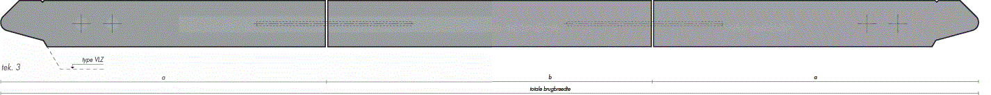 De brugbreedte wordt bepaald door toepassing van 1 plaat met 2 standaard randafwerkingen (tek. 1) of 2 platen elk met 1 standaard randafwerking (tek. 2) of 2 randplaten met 1 tussenbrugplaat (tek. 3).