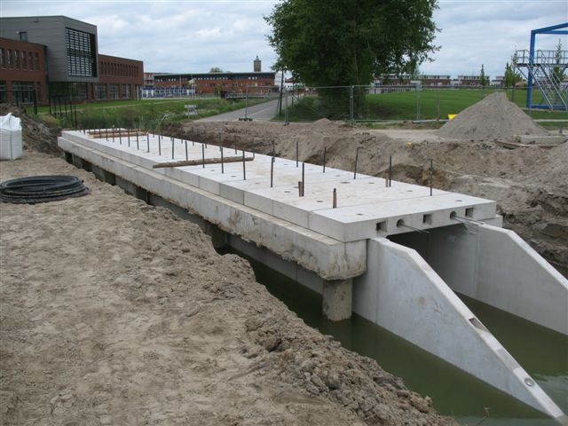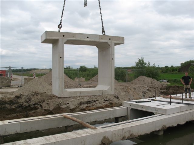 Na het voltooien van de langskespen worden de duikerelementen ingehangen, nadat de grond tussen de kespen en de palen (voorzover nodig) is verwijderd.