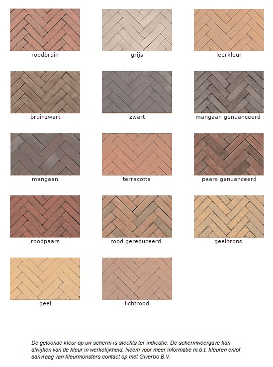 De hierna volgende afmetingen zijn gemiddeld, omdat de exacte maat afhangt van de soort klei en de hardheid. Tevens worden sommige soorten zowel normaal als plat verstraat. Aantal stuks per m2 gelden zowel staand verstraat (normaal) als liggend verstraat (plat).