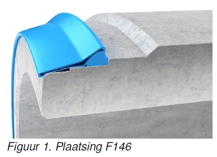 - Drainfilbuizen (mof, spie en glijrubberring F146) dienen in- en uitwendig schoon van zand en aarde te worden ingebouwd. Dan de rubberring om het spie-eind aanbrengen en de spanning in de rubberring rondom gelijkmatig verdelen. De rubberring moet op de juiste plaats op het spie-eind gelegd worden tegen de betonnen ‘borst’ (zie figuur 1).